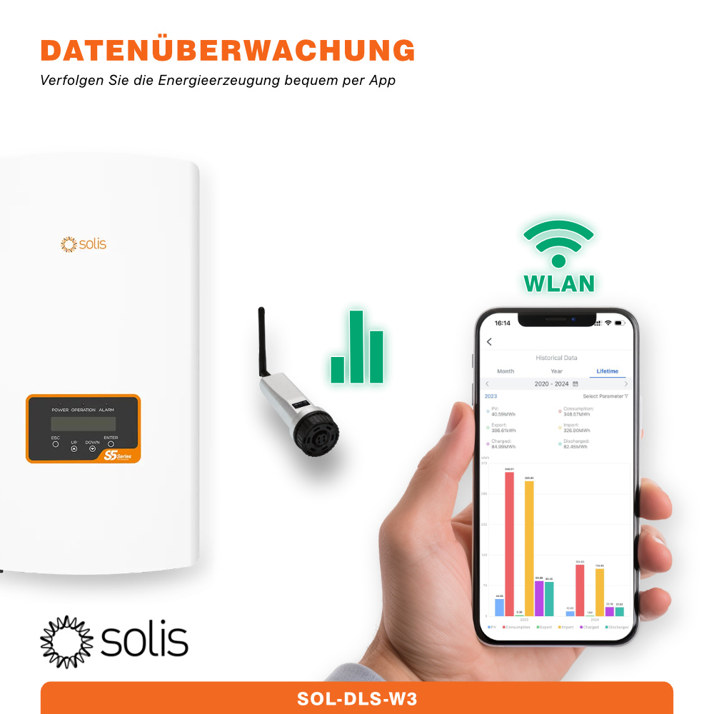 Dank des mitgelieferten WLAN-Sticks überwachen Sie Ihre Stromerzeugung jederzeit bequem per Smartphone oder Computer. Sie sehen in Echtzeit, wie viel Strom Sie erzeugen, wie hoch Ihr Eigenverbrauch ist und wie viel Sie ins Netz einspeisen. Die intuitive App ermöglicht die vollständige Kontrolle über Ihre Anlage – von überall aus.