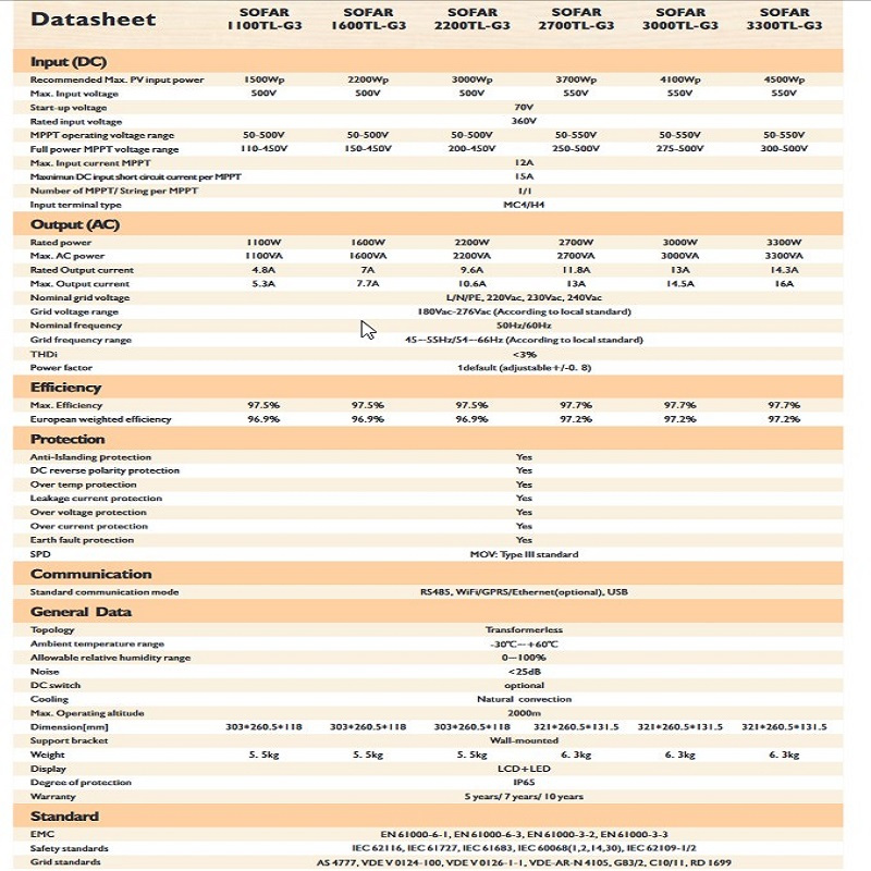 SOFAR Solarwechselrichter TL-Serie Hocheffizientes und kompaktes Design mit DC-Trennschalter und WIFI-Überwachung integriert. Spitzentechnologie, 10 Jahre Garantie! Die Wechselrichterserie Sofar Solar TL wurde speziell für kleine und mittlere Photovoltaikanlagen entwickelt. Sofar KTL hat einen maximalen Wirkungsgrad von 97,5%, was eine beispiellose Leistung bietet und es Ihnen ermöglicht, die maximale Energie in Ihrer Photovoltaikanlage zu nutzen.