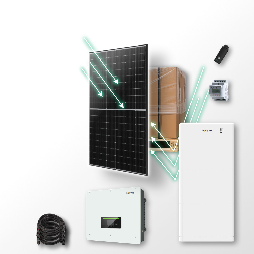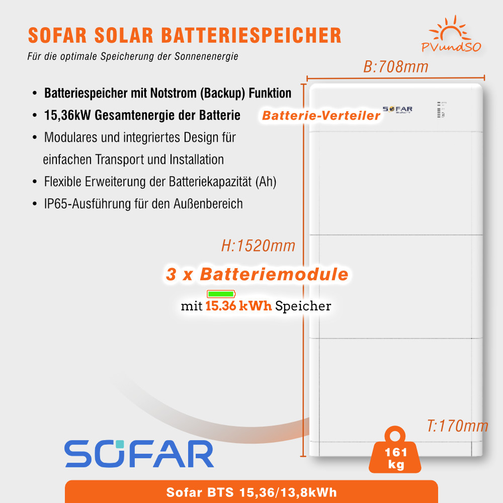 Solaranlage Photovoltaik 15kW mit 15kW Sofar Hybrid Wechselrichter (inkl. 3-Phasen Meter) + Sofar BTS 15,36/13,8kWh Batteriespeicher mit Notstrom (Backup) Funktion