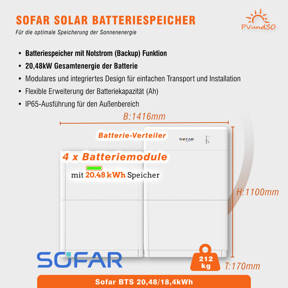 Solaranlage Photovoltaik 20kW mit 20kW Sofar Hybrid Wechselrichter (inkl. 3-Phasen Meter) + Sofar BTS 20,48/18,4kWh Batteriespeicher mit Notstrom (Backup) Funktion
