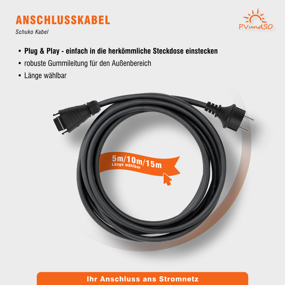Mit unserem Schuko-Anschlusskabel können Sie Ihr Balkonkraftwerk selbst ans Stromnetz anschließen – genauso wie Sie Ihre Kaffeemaschine oder Ihren Fernseher anschließen. Wählen Sie die benötigte Länge und vermeiden Sie Verlängerungsleitungen und potenzielle Fehlerquellen.