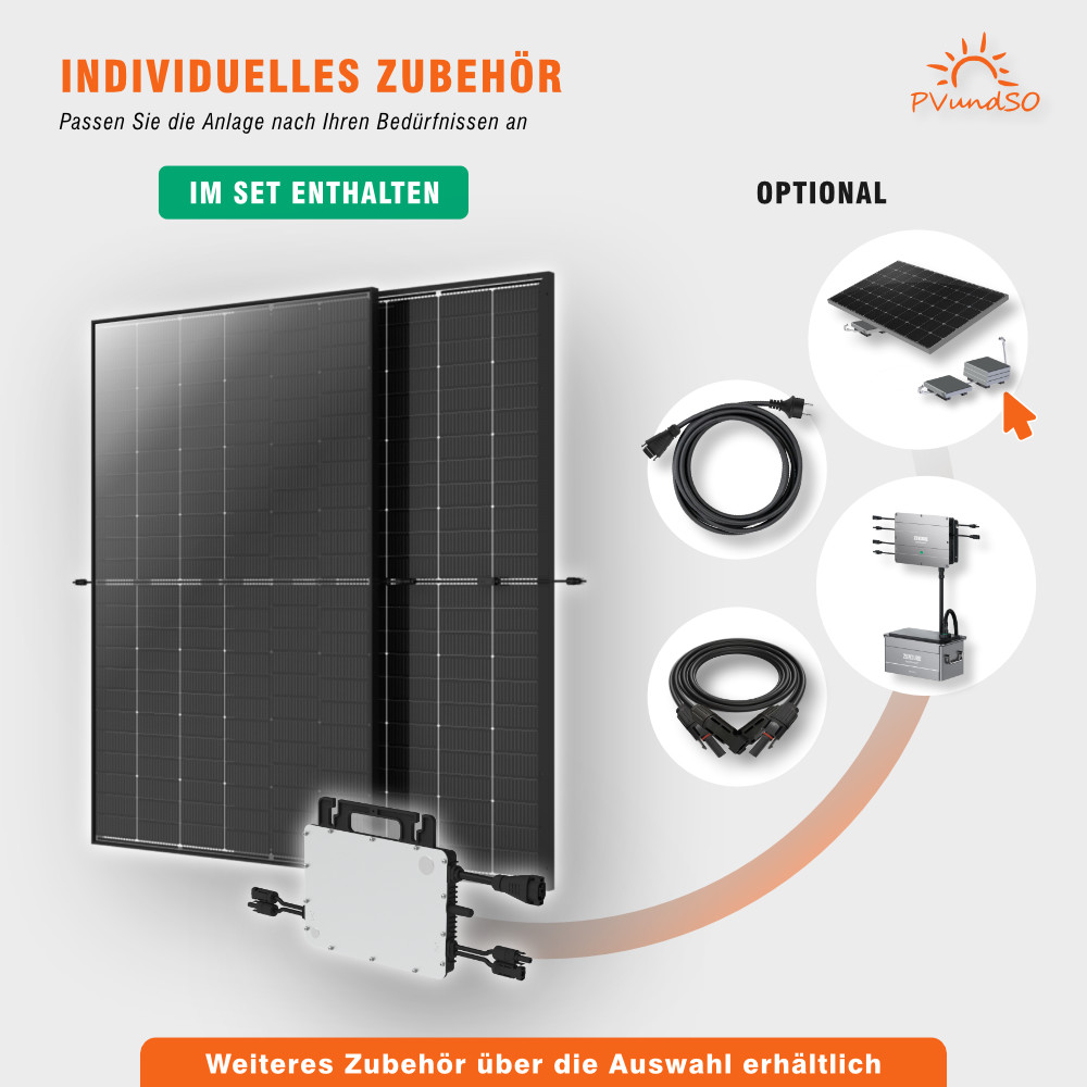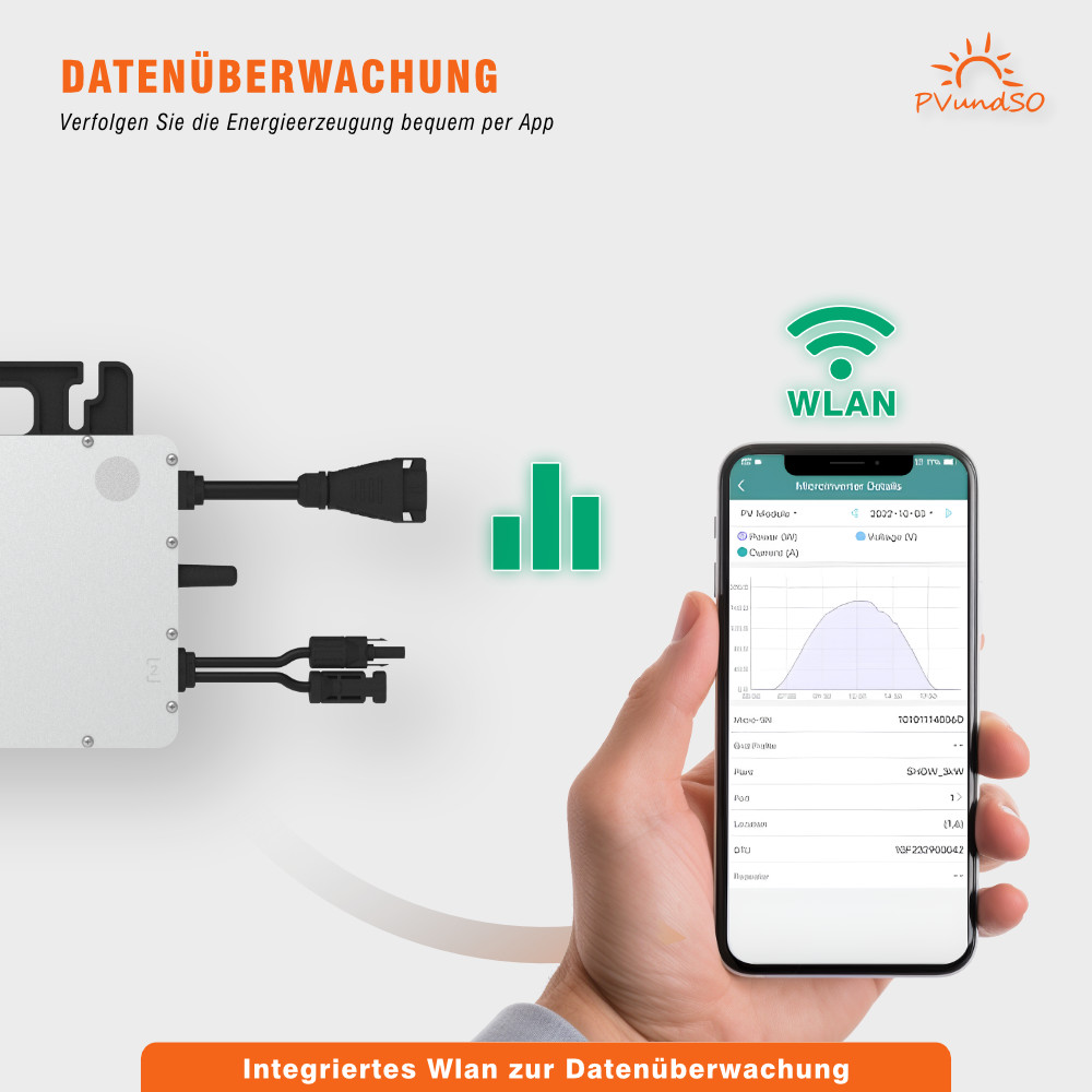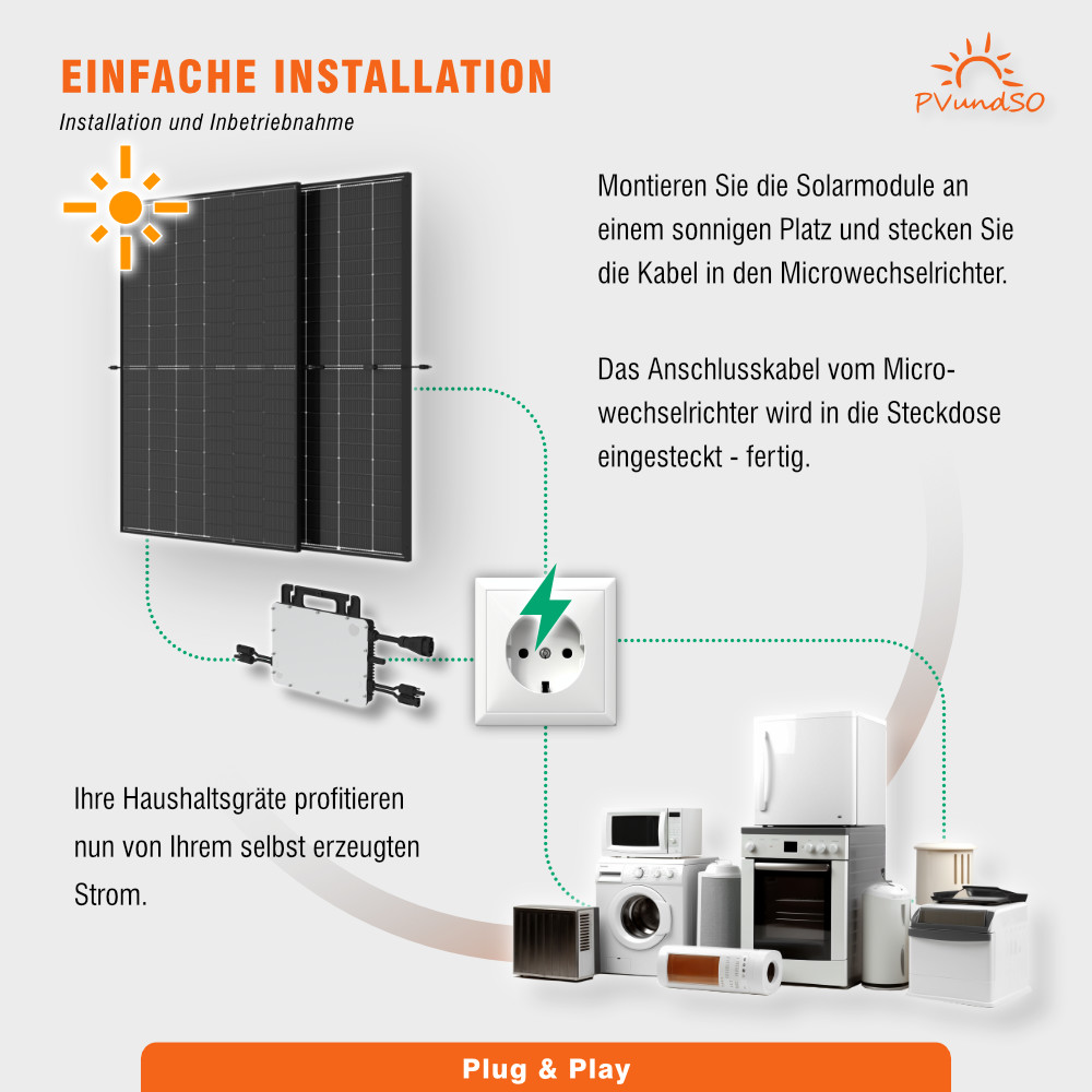 Zwei hochleistungsfähige Solarmodule verwandeln Sonnenenergie in elektrische Energie, während der Mikro-Wechselrichter diese für Ihren Haushalt umwandelt. Der Strom kann über eine ganz normale Steckdose eingespeist werden.