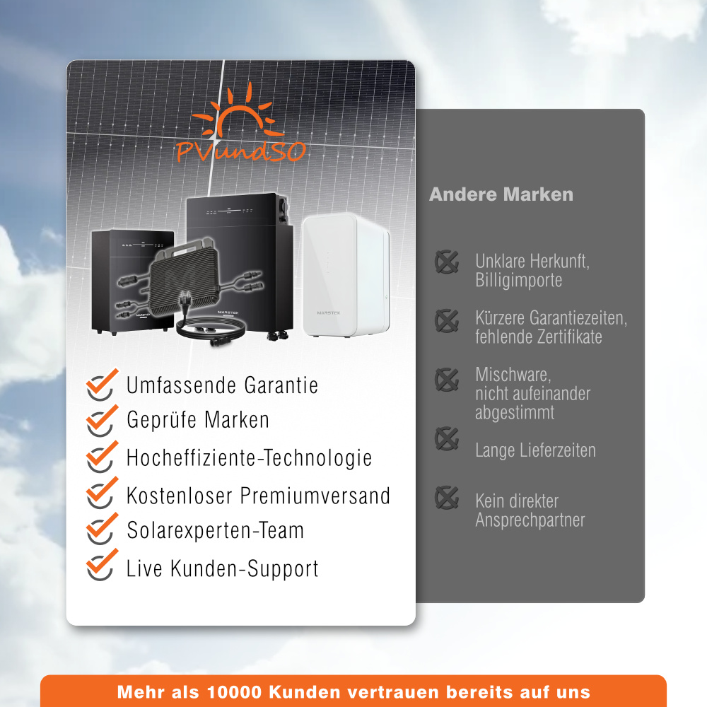 Ja, diese Anlage kann mit einem AC-gekoppeltem Speicher wie dem Marstek Venus E erweitert werden. Der Speicher wird zwischen Wechselrichter und Hausverteilung installiert und funktioniert unabhängig vom Solarwechselrichter. So können Sie auch abends und nachts Ihren selbst erzeugten Strom nutzen und erhöhen Ihren Eigenverbrauch.
