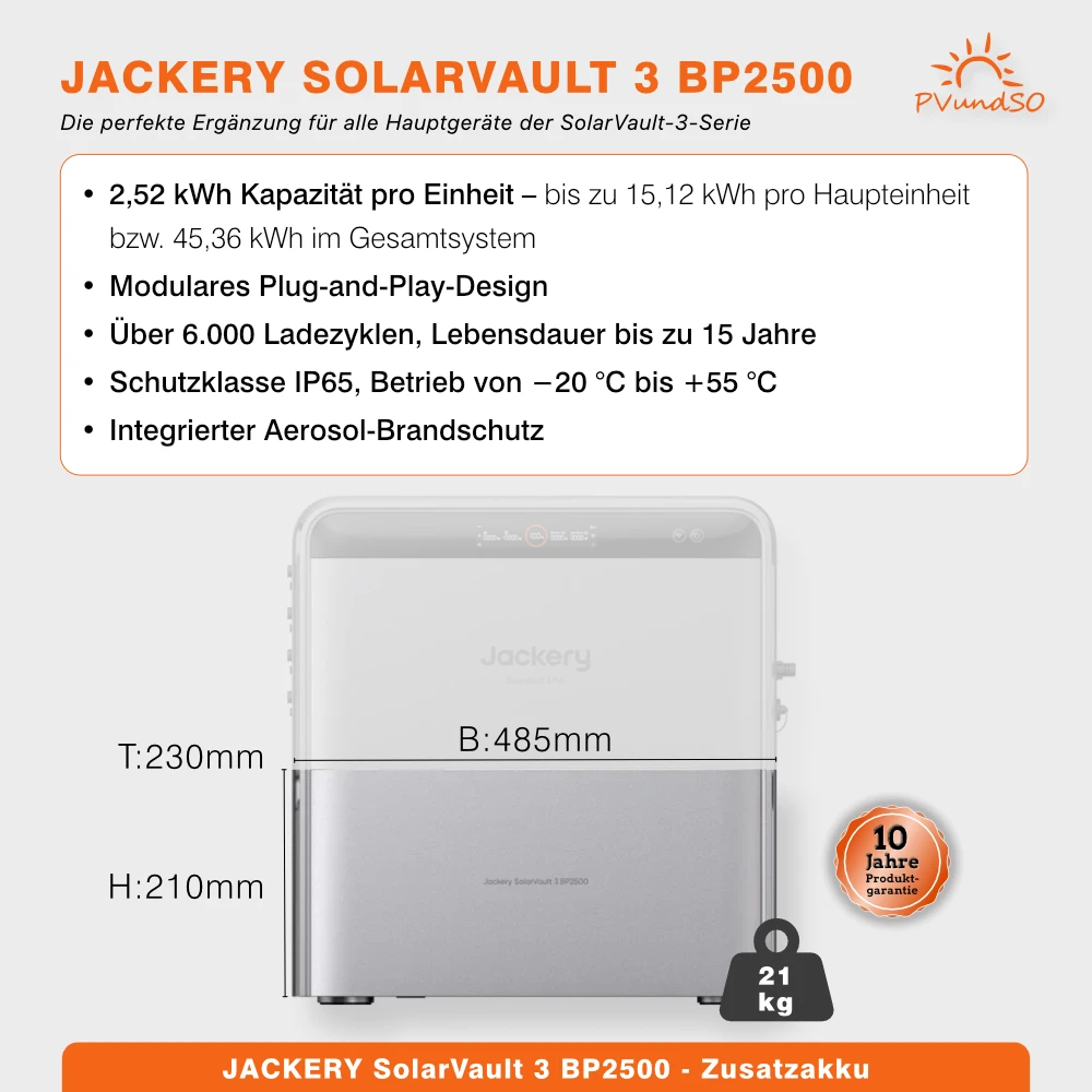 1 × Jackery SolarVault 3 Pro, 2 × JA-Solar-500-Wp-Solarmodul (bifazial, Black Frame oder Full Black je nach Verfügbarkeit), pro Modul 2 × 2-m-MC4-Kabel, AC-Anschlusskabel sowie Solarkabelentferner. Längere MC4-Kabel sind bei Bedarf im Auswahlmenü erhältlich.
