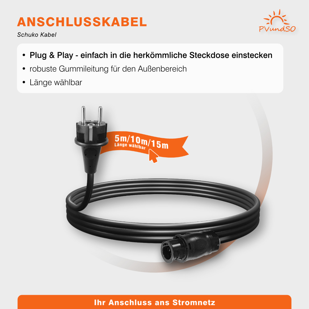 Mit unserem Schuko-Anschlusskabel können Sie Ihr Balkonkraftwerk selbst ans Stromnetz anschließen – genauso wie Sie Ihre Kaffeemaschine oder Ihren Fernseher anschließen. Wählen Sie die benötigte Länge und vermeiden Sie Verlängerungsleitungen und potenzielle Fehlerquellen.