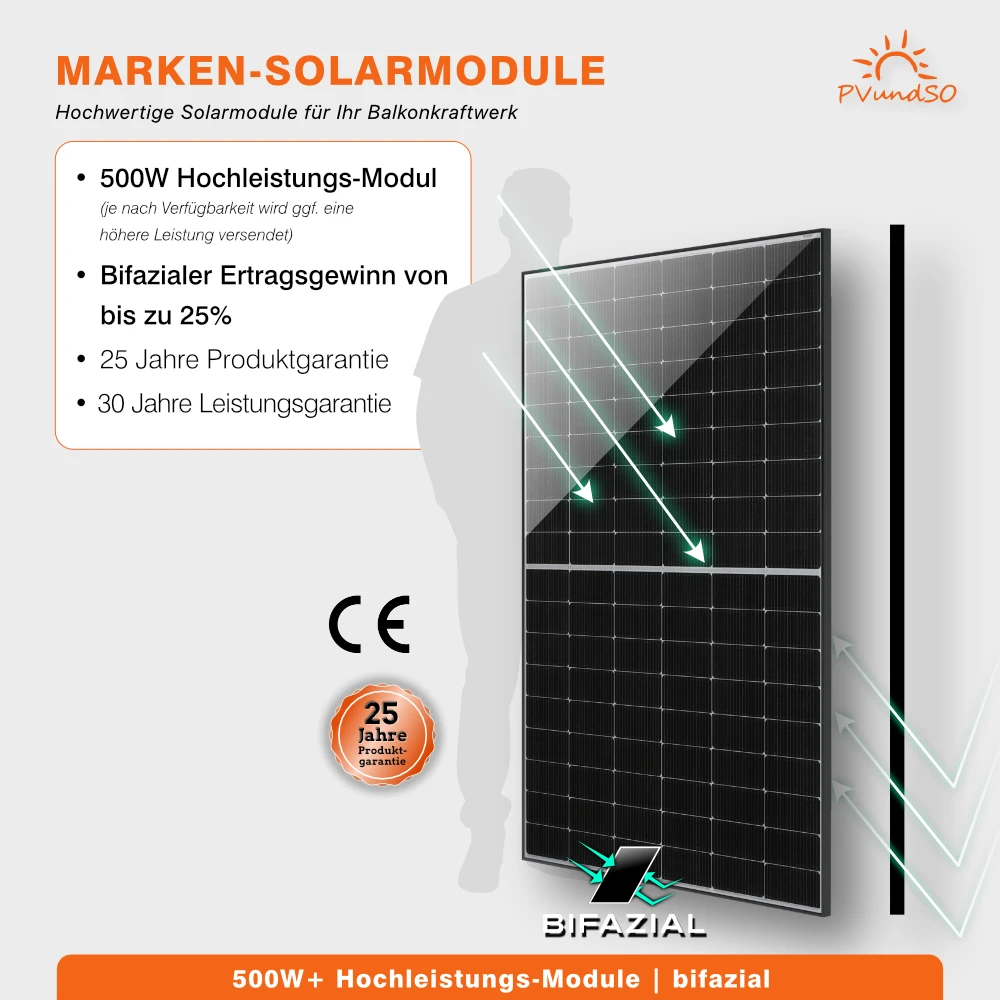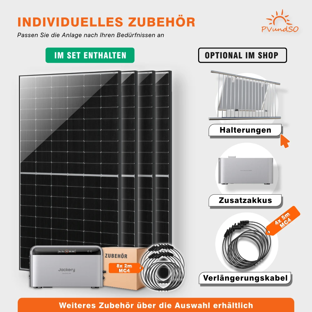 1 × Jackery SolarVault 3 Pro Max, 4 × JA-Solar-500-Wp-Solarmodul (bifazial, Black Frame oder Full Black je nach Verfügbarkeit), pro Modul 2 × 2-m-MC4-Kabel, AC-Anschlusskabel sowie Solarkabelentferner. Längere MC4-Kabel sind bei Bedarf im Auswahlmenü erhältlich.