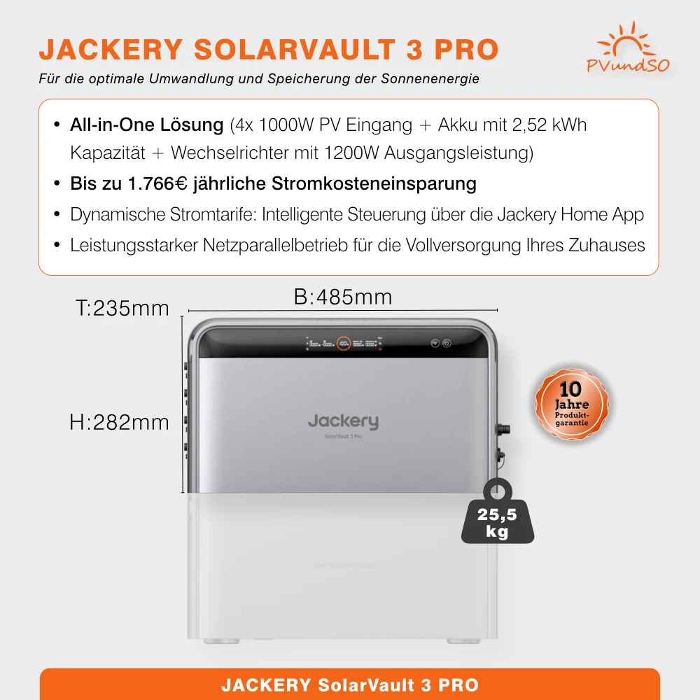 1 × Jackery SolarVault 3 Pro, 4 × JA-Solar-500-Wp-Solarmodul (bifazial, Black Frame oder Full Black je nach Verfügbarkeit), pro Modul 2 × 2-m-MC4-Kabel, AC-Anschlusskabel sowie Solarkabelentferner. Längere MC4-Kabel sind bei Bedarf im Auswahlmenü erhältlich.