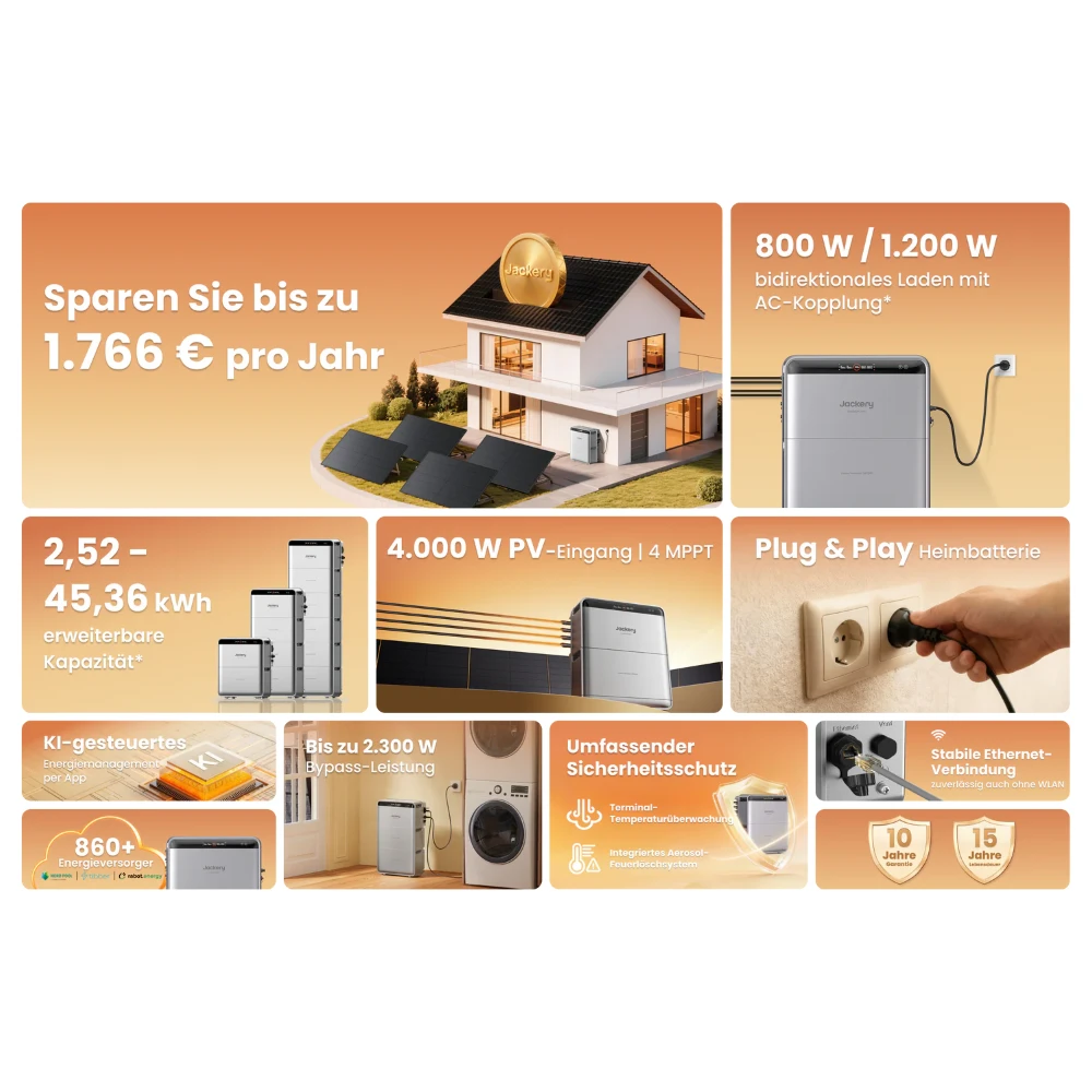- App-Steuerung mit KI-Energiemanagement: Eigenverbrauch, Tarifmodus und KI-Smart-Modus bequem per Jackery-App konfigurieren.