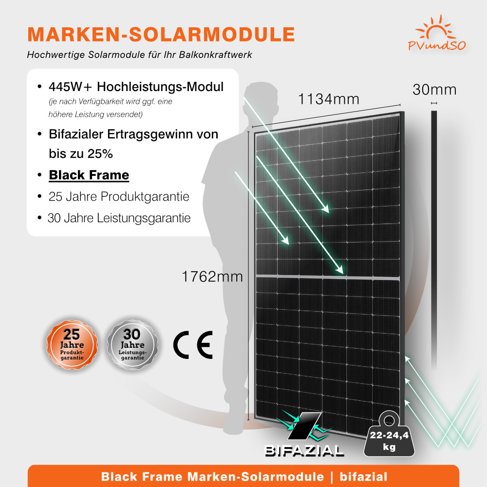 Im Set enthalten sind 2 hochwertige 450W Solarmodule von Astronergy, die Sie nach Ihren Designwünschen wählen können – klassisch mit schwarzem Rahmen oder elegant in durchgängiger Full-Black-Optik. Beide Varianten überzeugen durch TÜV-geprüfte Qualität und umfassende Garantien: 30 Jahre auf Leistung und 25 Jahre auf das Produkt.