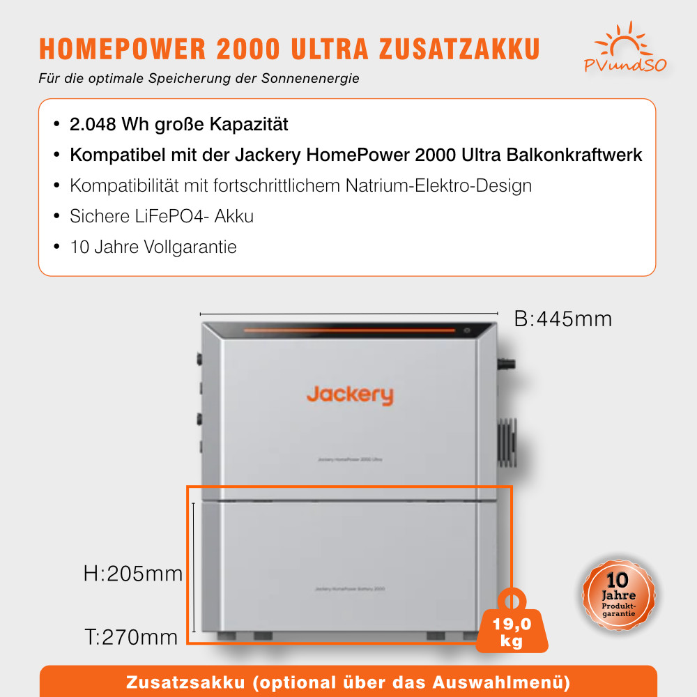 Die Jackery HomePower 2000 Ultra ist ein vielseitiger Energiespeicher für den Einsatz im Haushalt und in Kombination mit Balkonkraftwerken. Sie kann wahlweise über Solarpanels oder direkt über das Stromnetz geladen werden. Die Basiseinheit enthält einen langlebigen LiFePO₄-Akku mit einer Kapazität von 2 kWh und lässt sich durch bis zu drei Erweiterungsmodule auf insgesamt 8 kWh ausbauen.