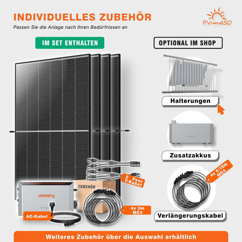 Dieses Balkonkraftwerk besteht aus 4x 450W Marken-Solarmodulen und dem Jackery HomePower Ultra 2000 Speicher-Wechselrichter. Eine All-in-One-Lösung mit integriertem, robustem Mikrowechselrichter und intelligentem Batteriemanagement-System (BMS).