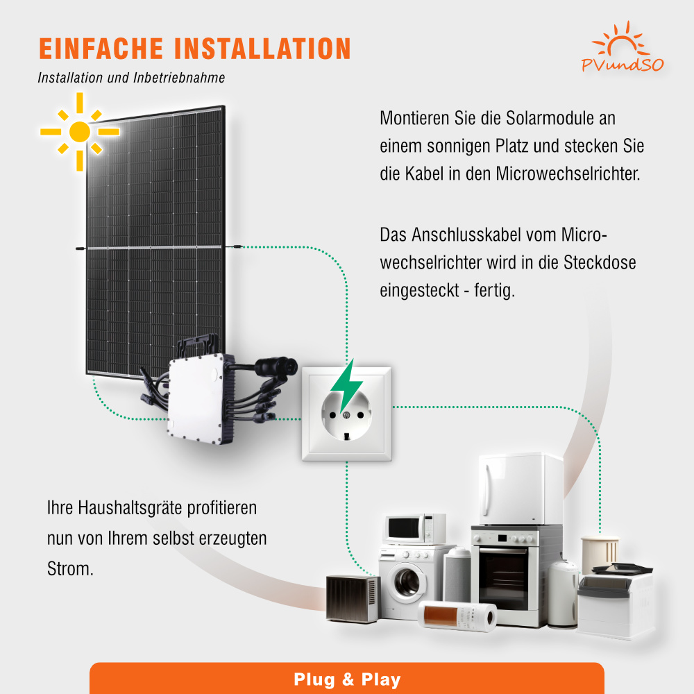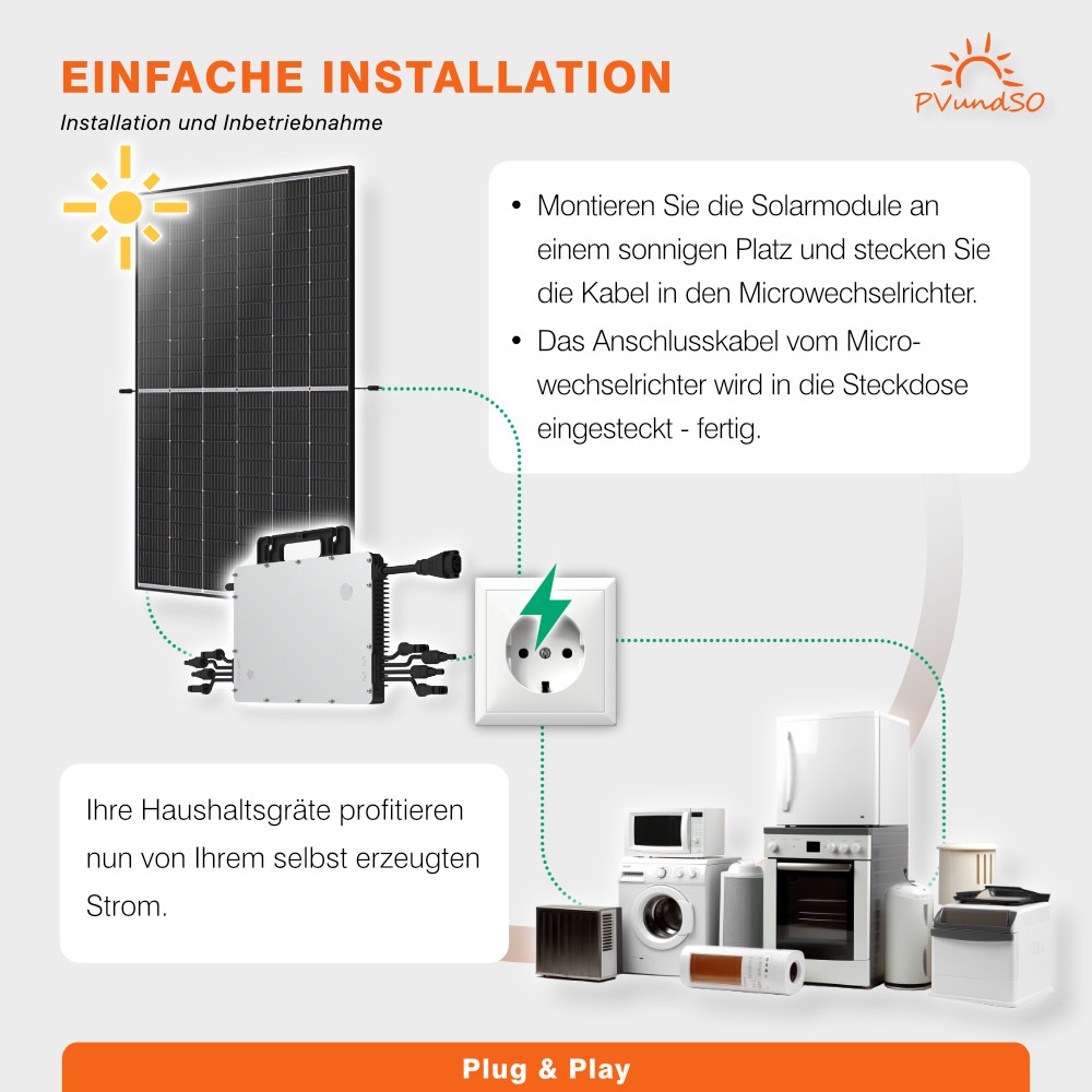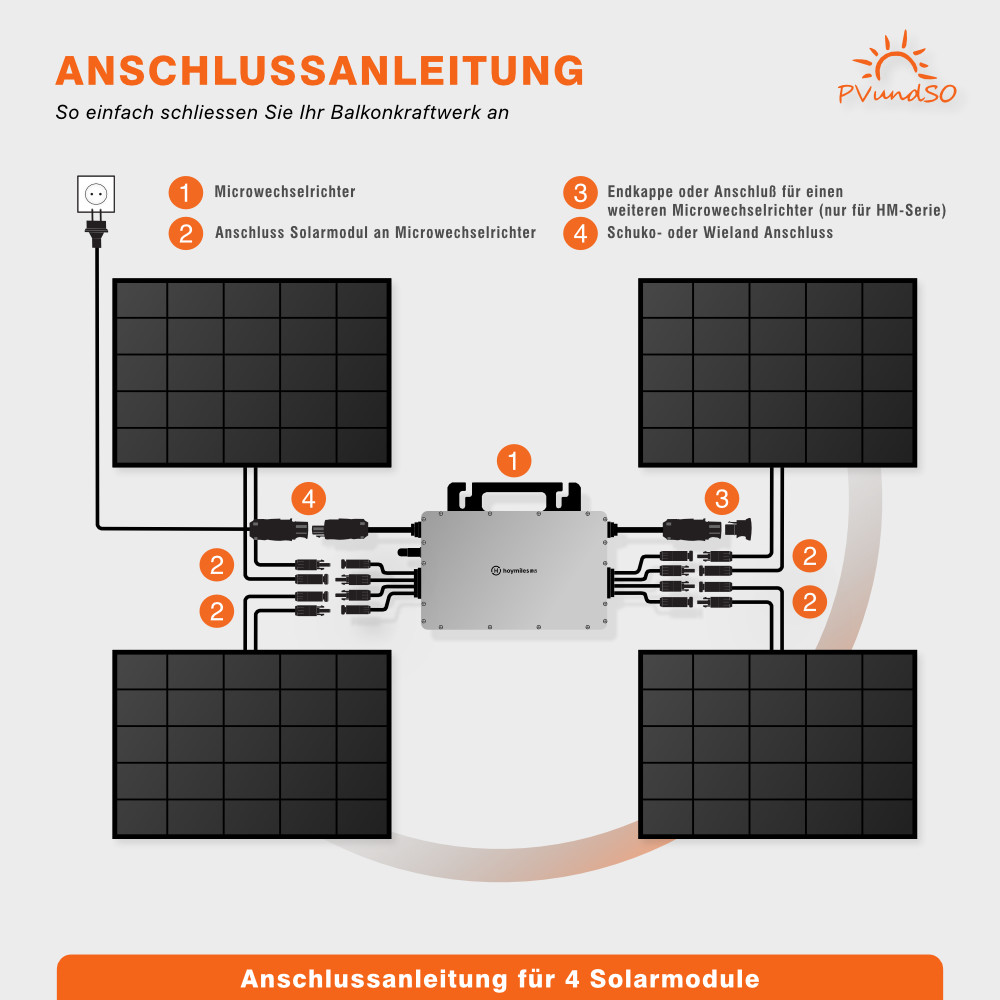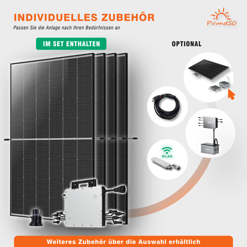 - Leistungsstarker 1200W Wechselrichter für vier Solarmodule (auf 800W drosselbar)