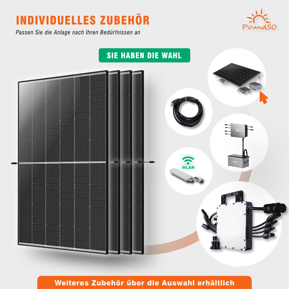 Das Set enthält 4 hocheffiziente bifaziale Module, die sowohl direkte als auch reflektierte Sonneneinstrahlung nutzen. Zur Auswahl stehen zwei Varianten: klassisch mit schwarzem Rahmen oder elegant in durchgängig schwarzer Full Black Ausführung.