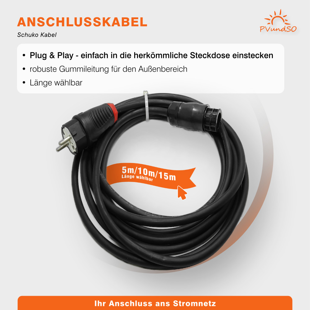 Falls Sie die Solarmodule weiter auseinander platzieren wollen oder den Wechselrichter nicht hinter den Modulen montieren können, dann bieten wir Ihnen MC4-Kabel in verschiedenen Längen an.