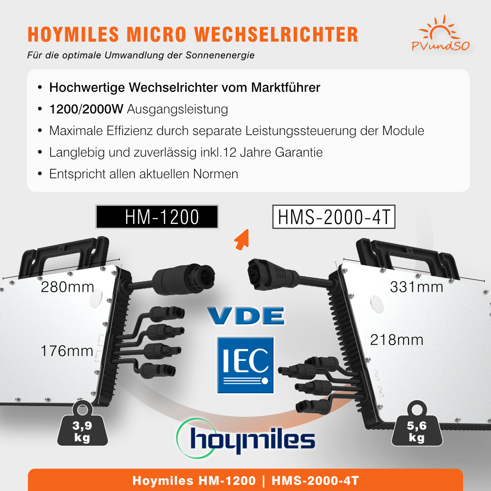 Für Ihr Balkonkraftwerk MAXI können Sie zwischen zwei hochwertigen Mikrowechselrichtern von Hoymiles wählen – dem bewährten HM-1200 oder dem HMS-2000-4T der neuesten Generation. Beide Wechselrichter überzeugen durch hohe Qualität, sind nach IP67 wettergeschützt für den jahrelangen Außeneinsatz und können über eine optionale DTU per WLAN überwacht werden.