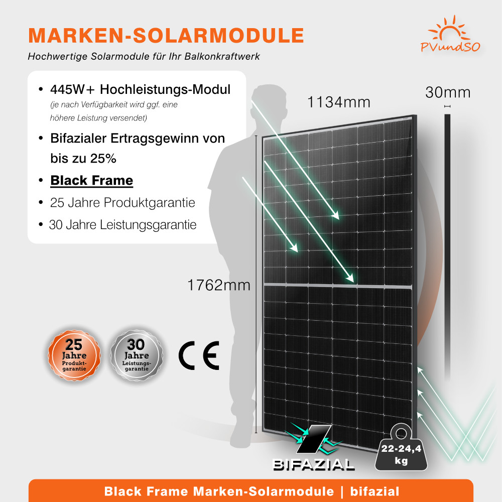 Im Set enthalten sind 4 hochwertige 450W Solarmodule von Astronergy, die sowohl direkte als auch reflektierte Sonneneinstrahlung nutzen. Zur Auswahl stehen zwei Varianten: klassisch mit schwarzem Rahmen oder elegant in durchgängig schwarzer Full Black Ausführung.