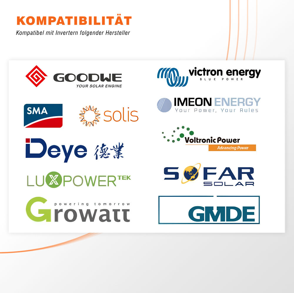 Dyness ist kompatibel mit den meisten führenden Wechselrichtern auf dem Markt folgender Hersteller (eine vollständige Liste aller kompatiblen Inverter finden Sie über diesen Link): Compatibility_List_Dyness.pdf