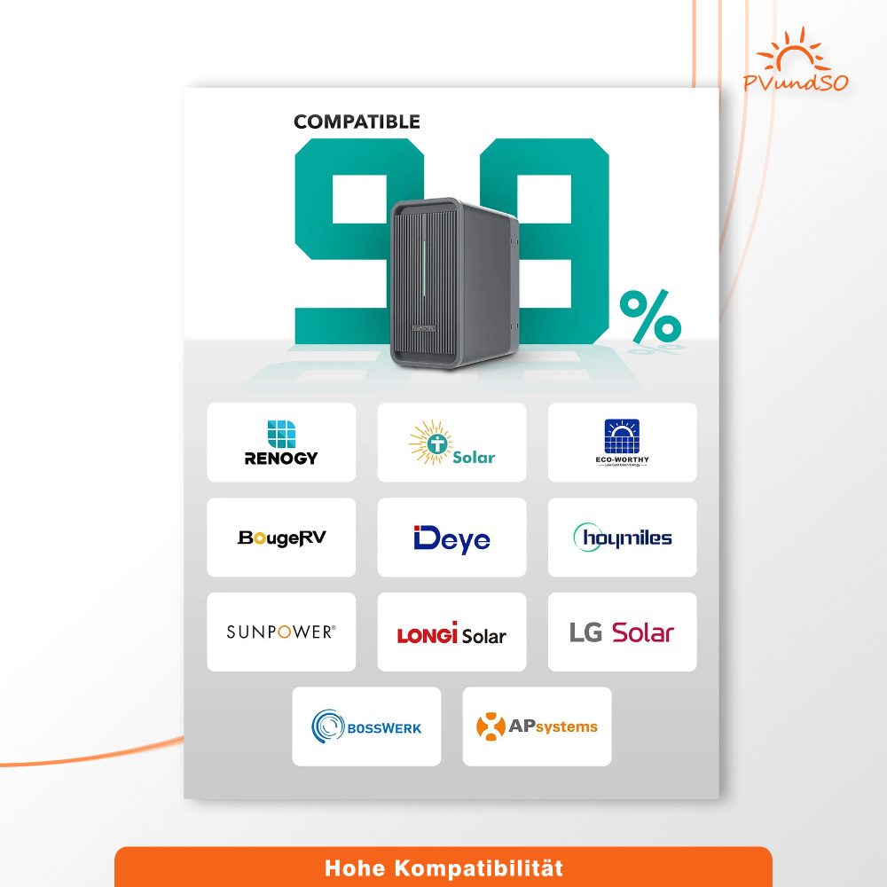 - Intelligentes Energiemanagement per App: Der integrierte Energiemanager optimiert die Speicherung und Nutzung Ihrer Solarenergie und steigert so Ihren Eigenverbrauch und reduziert Ihre Energiekosten.