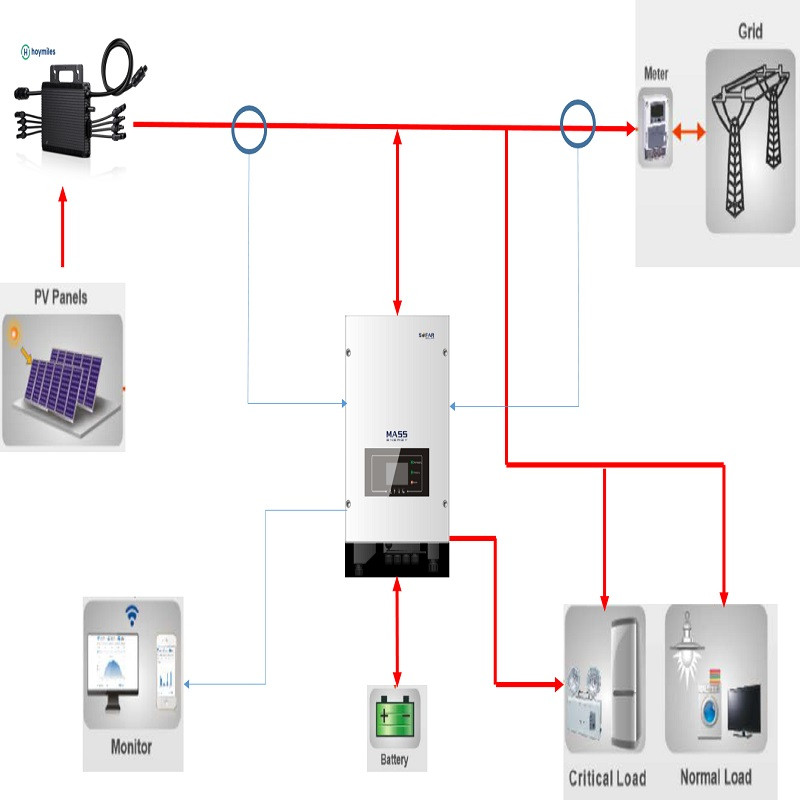 Der Sofar ME3000SP wird über einen freien Sicherungsabgang(16A) direkt mit dem Hausnetz verbunden. Die beiligenden Stromzangen werden vor dem Hauszähler installiert. Das Gerät erkennt automatisch ob überschüssiger Strom aus der PV-Anlage vorhanden ist und nutzt diesen zum Laden der Batterie. Ist der Verbrauch im Haus höher als die Produktion aus der PV-Anlage, wird Strom aus der Batterie eingespeist. Das Gerät regelt soweit technisch möglich auf Nulleinspeisung bzw. Nullbezug. Eine Stromzange kann für die Messung der erzeugten Wechselrichterleistung genutzt werden.