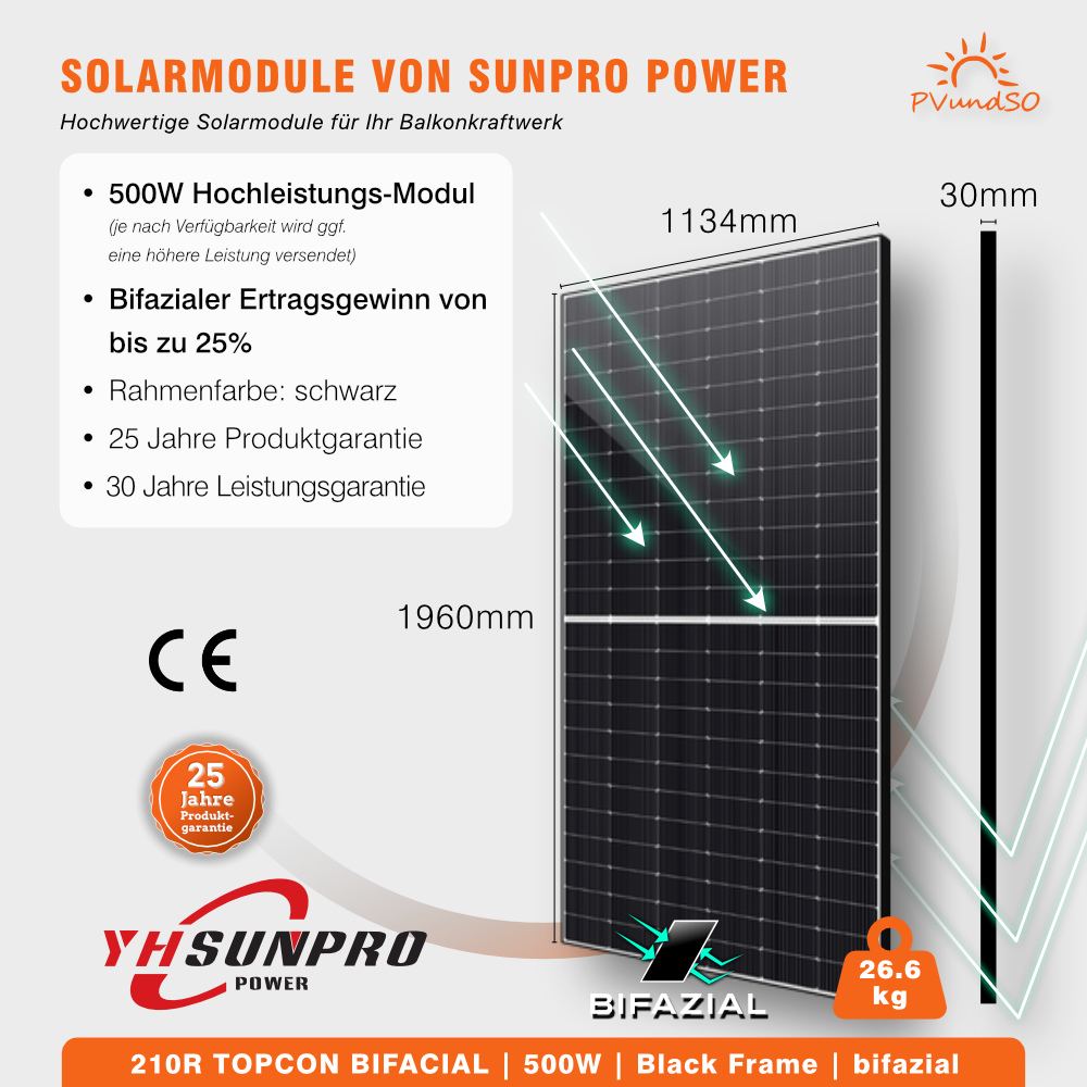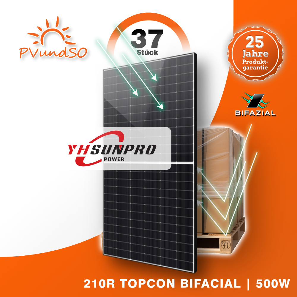 Bei Lieferungen in Nicht-EU-Länder können zusätzliche Zölle, Steuern und Gebühren anfallen.Solarmodule 37x 500W Black Frame bifazial – SUNPRO POWER 210R TOPCON BIFACIAL 500W