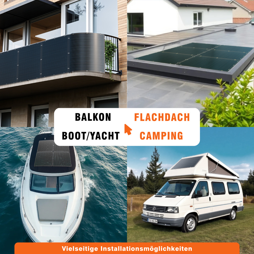 Dieses Set besteht aus vier flexiblen Solarmodulen mit jeweils 220 W Leistung und bietet eine ideale Lösung für die Installation auf Balkonen, insbesondere dort, wo herkömmliche starre Module nicht montiert werden können. Die leichten Module lassen sich von einer Person mit Klettbändern am Balkongeländer befestigen, was eine unkomplizierte und werkzeuglose Montage ermöglicht.